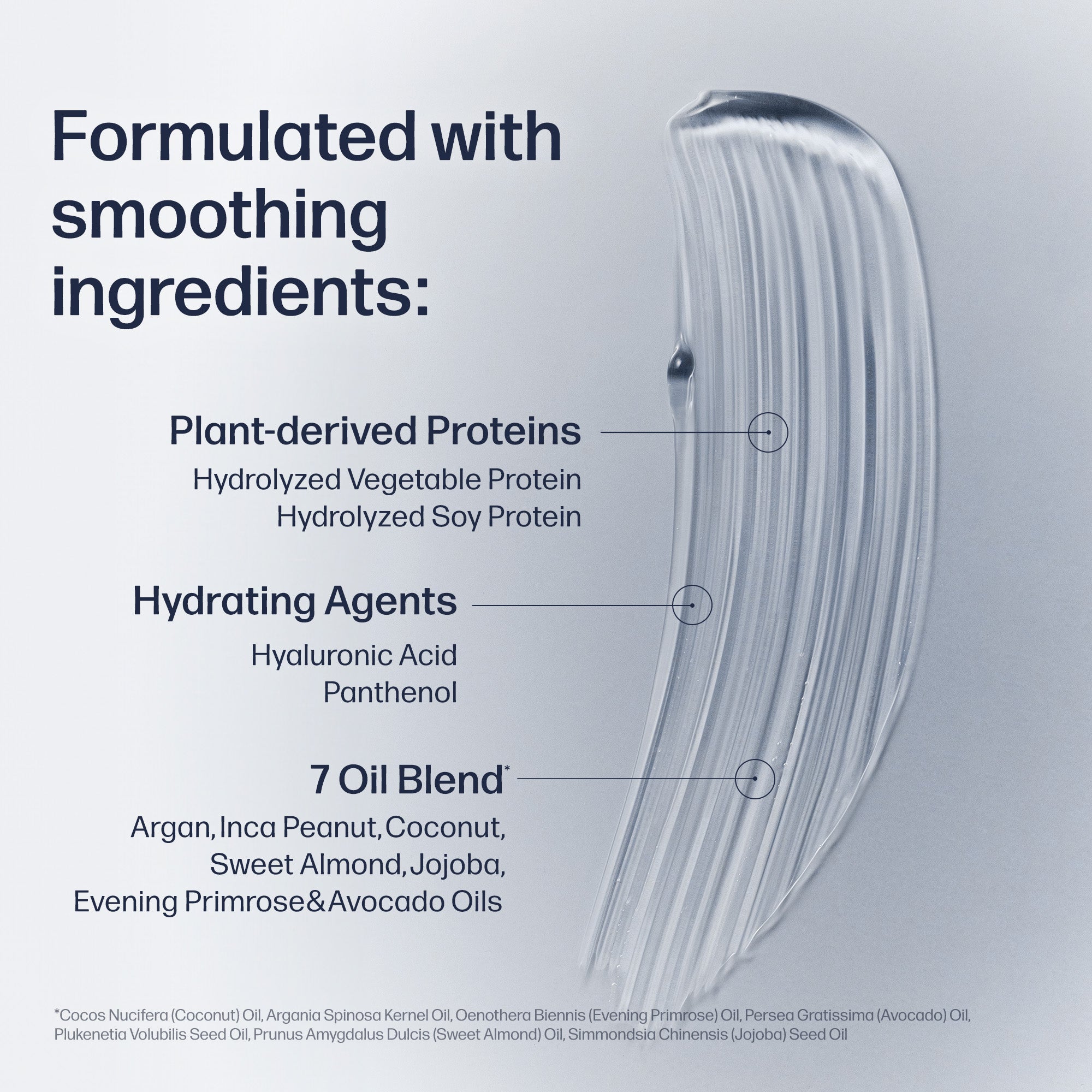 Water/Aqua/Eau, Alcohol Denat., PVP, VP/VA Copolymer, Alcohol, 1,2-Hexanediol, Butylene Glycol, PEG-40 Hydrogenated Castor Oil, Fragrance/Parfum, Carbomer, Tromethamine, Ethylhexylglycerin, Hydroxyethylcellulose, Disodium Phosphate, Polysorbate 60, Oenothera Biennis (Evening Primrose) Oil, Betaine, Sodium Phosphate, Prunus Amygdalus Dulcis (Sweet Almond) Oil, Squalane, Argania Spinosa Kernel Oil, Persea Gratissima (Avocado) Oil, Cocos Nucifera (Coconut) Oil, Tocopherol, Panthenol, Hydrolyzed Soy Protein, Simmondsia Chinensis (Jojoba) Seed Oil, Plukenetia Volubilis Seed Oil, Hydroxypropyltrimonium Hyaluronate, Maltodextrin, Hydrolyzed Vegetable Protein, Acacia Concinna Fruit Extract, Terminalia Ferdinandiana Fruit Extract, Linalool, Hexyl Cinnamal, Benzyl Salicylate, Citronellol, Limonene, Coumarin, Geraniol