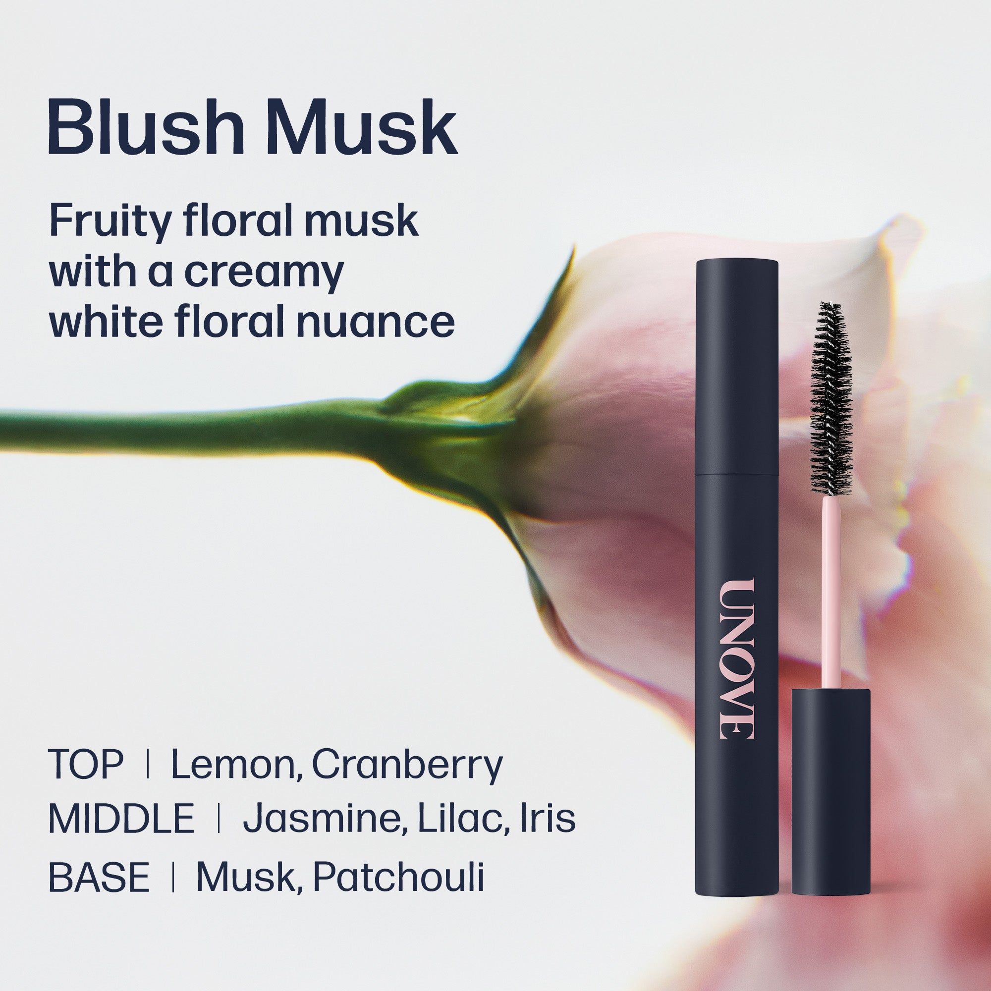 UNOVE blush musk product with floral background and description text.