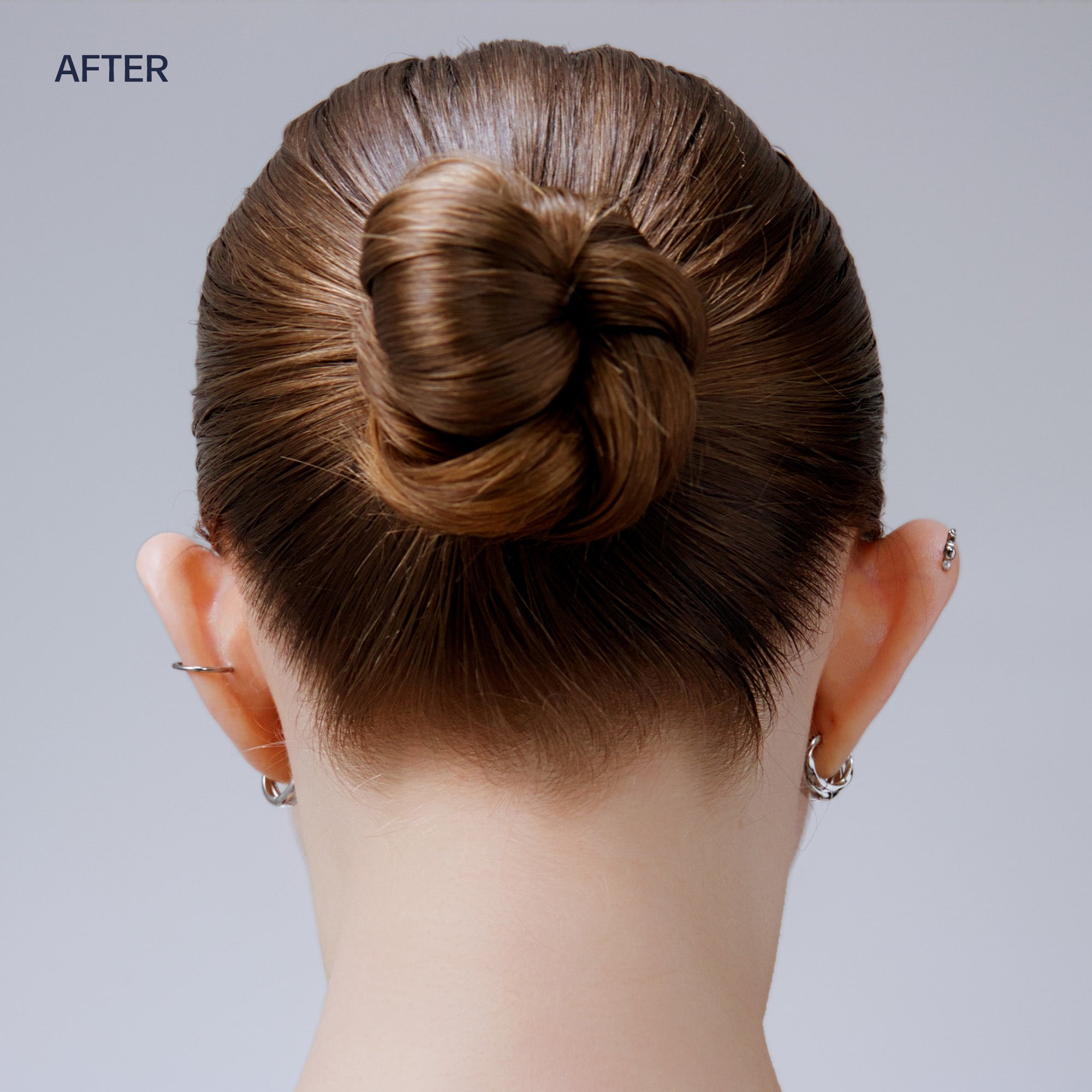 Back view of a person with styled hair bun on a plain background