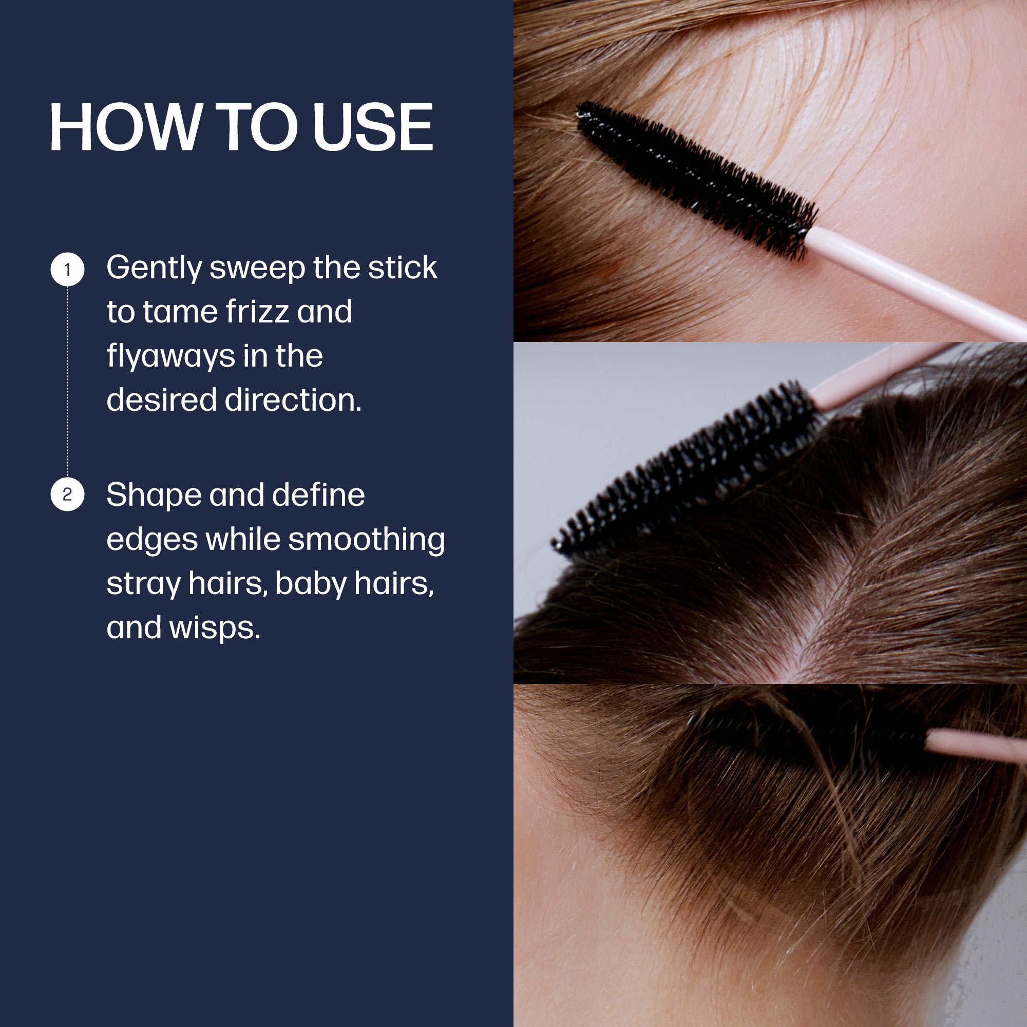 Instructions on how to use a hair styling stick with close-up images of application.